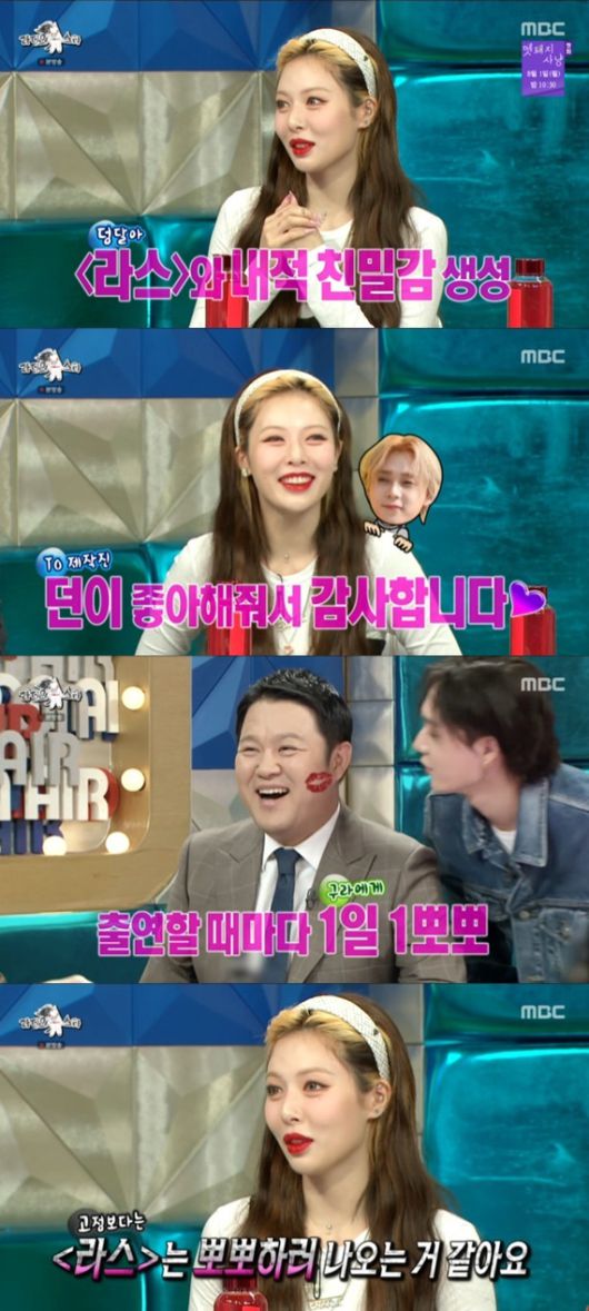 더불어 현아는 던이 '라디오스타'에서 가장 자연스러운 모습을 보여준다며 던의 '라디오스타' 사랑을 전했다. 이어 현아는 '라디오스타'에서 김구라에게 볼 뽀뽀를 하며 화제를 모았던 던을 언급, "던은 '라디오스타'에 뽀뽀하러 나오는 것 같다"라고 너스레를 떨며 웃음을 자아냈다.