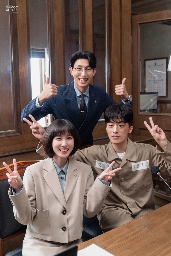 공개된 사진에는 구교환이 드라마 촬영 중 구치소에 수감된 모습과 법정에서 박은빈, 강기영 배우와 함께 브이를 만드는 모습이 담겼다.