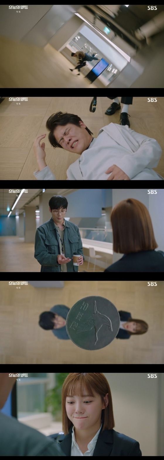 29일 오후 첫 방송된 SBS 금토드라마 '오늘의 웹툰'에서는 네온 웹툰의 부편집장 석지형(최다니엘 분)이 온마음(김세정 분)과 두 번째 만남에서 동전 던지기로 응원하는 모습이 담겼다.