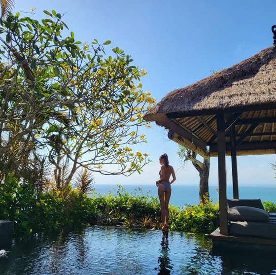 한혜진은 바다가 내려다 보이는 평화로운 야외 수영장에서 비키니 수영복을 입고 놀라운 비율의 늘씬한 몸매를 뽐냈다. 단지 뒷모습을 찍었을 뿐이지만, 그 자체로 화보 같은 느낌을 주며 톱모델의 위엄을 드러냈다.