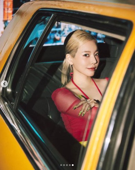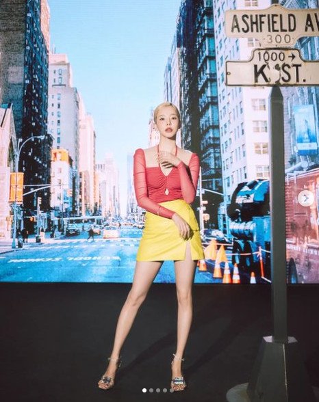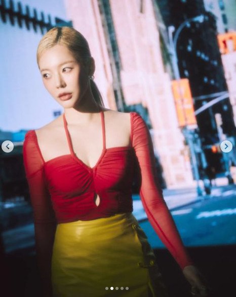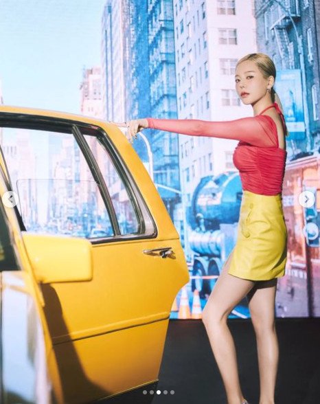 사진에서 써니는 강렬한 레드 컬러의 홀터넥이 돋보이는 상의를 완벽하게 소화하고 있는 모습이다. 그는 네크라인이 깊게 파인 상의로 섹시미를 더했다. 특히 노란색 가죽 치마도 완벽하게 소화하며 늘씬한 각선미도 자랑했다.