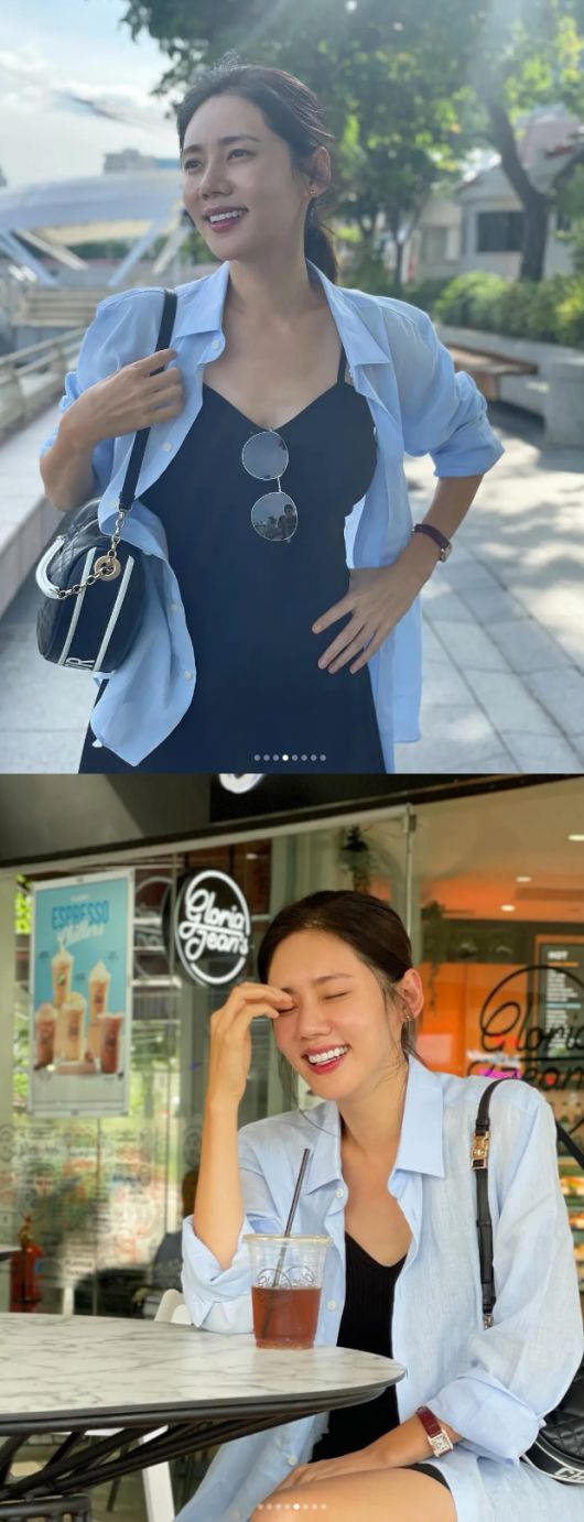 또 다른 사진에서 추자현은 야외 테라스에서 커피를 마시고 있는 모습이다. 추자현은 커피를 마시며 여유를 즐기는가 하면, 카메라를 향해 환한 미소를 보이기도 했다.