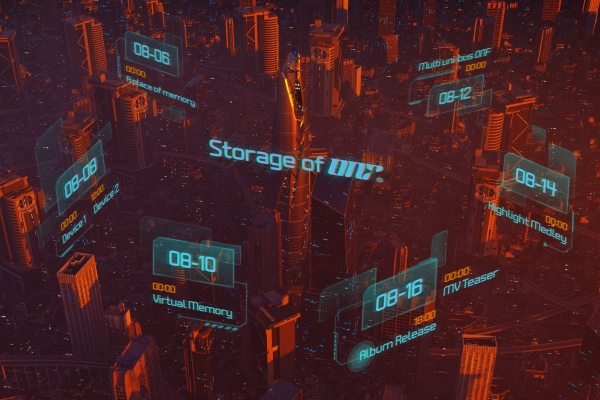 공개된 타임테이블은 어두운 도시의 풍경 위로 앨범명인 ‘스토리지 오브 온앤오프’와 이를 둘러싼 일정이 나타나 시선을 집중시킨다. 공중에 홀로그램으로 떠 있는 문구들과 고층 건물, 복잡한 도로가 어우러져 마치 미래 도시를 보는 듯한 느낌을 준다.