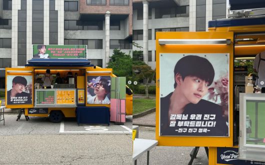 사진에는 정국이 촬영장에 보낸 커피차 모습이 담겨있다. 특히 “감독님 우리 진구 잘 부탁드립니다”라는 정국의 애교 가득 문구가 두 사람의 훈훈한 우정을 엿보게 한다.