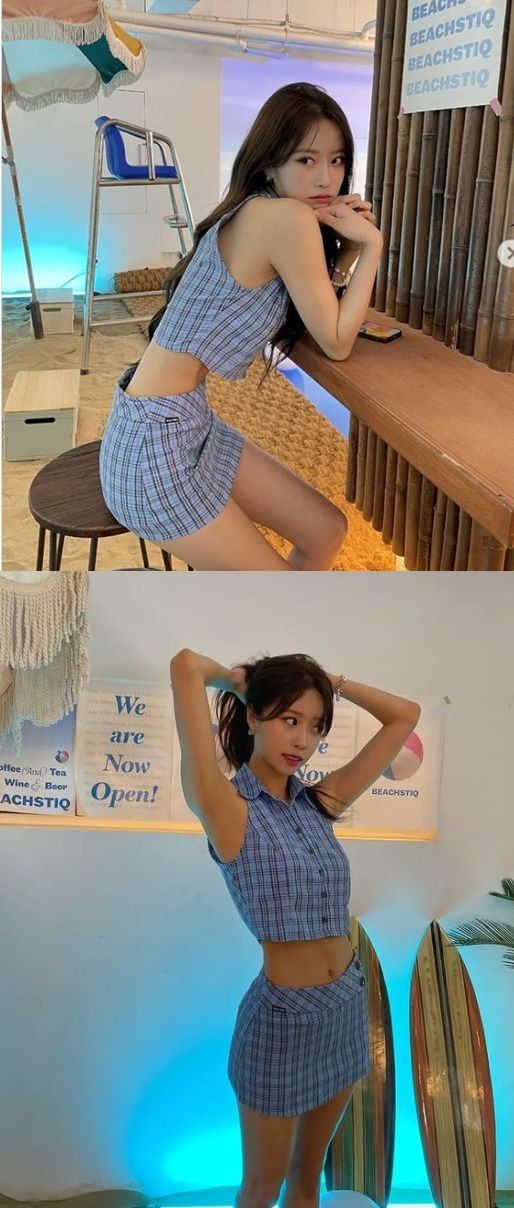 이미주, 하늘색 체크 무늬 베스트와 미니스커트 입고 스키니 몸매 자랑