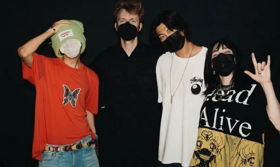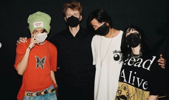 사진 속에는 편안한 복장의 제이홉과 RM이 빌리 아일리시와 아일리시의 친오빠인 피니어스와 함께 포즈를 취한 모습이다.