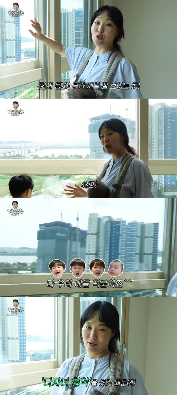 정주리는 "평수는 이전집과 똑같다"며 "같은 43평"이라고 전했다. 이어 "다 우리 애들 덕분"이라며 "셋째 도하 때 다자녀 청약을 썼다"고 밝혔다.