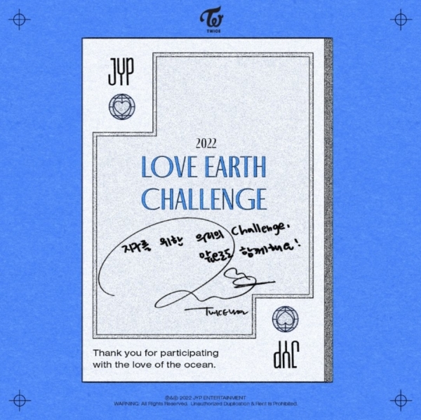 챌린지 기간은 8월 22일부터 9월 18일까지로 참여 방법은 미션을 실천한 후 지구공 앱에서 미션 사진을 업로드하면 된다. 사진을 올리면 최애 아티스트의 손글씨 온라인 카드 획득이 가능하다. 우수 참가자는 아티스트 굿즈를 선물로 받을 수 있다. 참고로 지구공 앱 미션 1건당 1만원씩 해양보호활동에 후원된다.