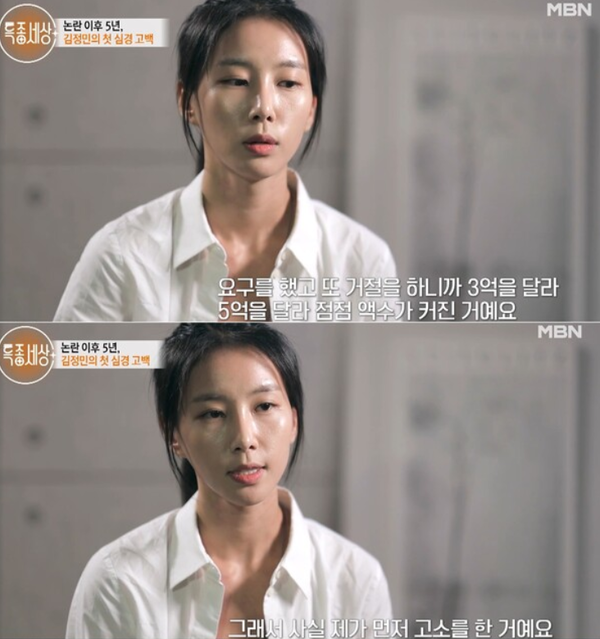 특히 김정민은 "진짜 많은 악플이 있었다. 혼인 빙자부터 '꽃뱀' 등 입에 담을 수 없는 악플"이라며 "프로그램에서도 하차했다. (재판) 결과가 나오길 기다렸는데, 그 전에 거의 바닥을 친 이미지는 회복이 어려울 것 같았다. 그래서 합의하고 상대방은 유죄 판정을 받아 처벌을 받았다. 난 무죄로 재판을 마무리 지었다"고 짚었다. 극단적인 생각도 했다며 "한 번은 거실에 누워있는데 정말 차분한 상태였다. 근데 '뛰어내리고 싶다'는 생각이 순간적으로 들더라"며 "당시 모든 사람이 나를 안 좋게 보는 것 같았다"고 털어놨다.