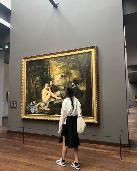 이어 프랑스 오르세 미술관에서 에두아르 마네의 그림 '풀밭 위의 점심 식사'를 감상하며 그림에 집중하고 있다.