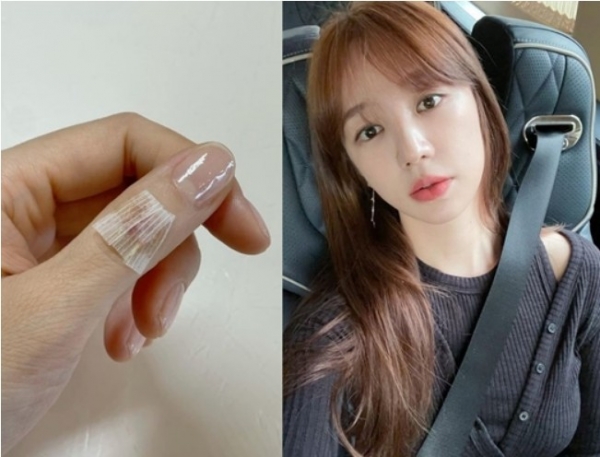 공개된 사진 속 윤은혜는 멍한 표정으로 차 안에 있는 모습이다. 연이은 사진에서는 다친 엄지 손가락을 공개해 걱정을 안겼다.
