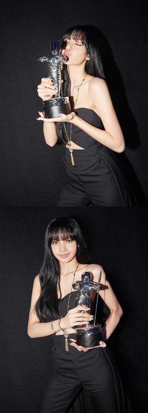 함께 공개된 사진 속에는 가녀린 쇄골이 드러난 의상을 입고 검은 벽을 배경으로 '베스트 K-팝' 트로피를 들고 있는 리사의 모습이 담겼다. 그는 트로피에 입을 맞추는 포즈를 취하며 수상 기쁨을 드러냈다.