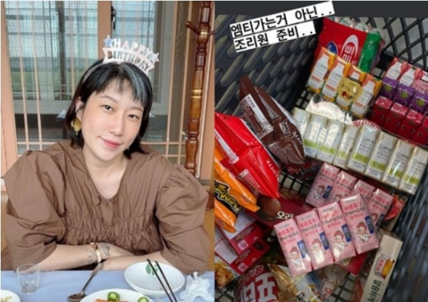 지난 5일 김영희는 자신의 인스타그램 스토리에 "엠티 가는 거 아닌… 조리원 준비…"라는 글과 함께 사진을 게재했다.
