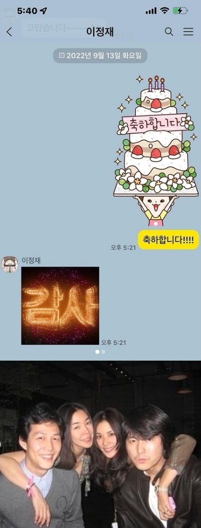 이혜영은 13일 인스타그램에 "세상 자랑스러운 나의 친구 정재님이 이 바쁘고 정신없을텐데 바로 답장!"이라며 이정재와 나눈 메시지 화면을 공개했다. 메시지에서 이혜영이 축하의 이모티콘을 보내자, 이정재도 '감사' 이모티콘으로 답했다.