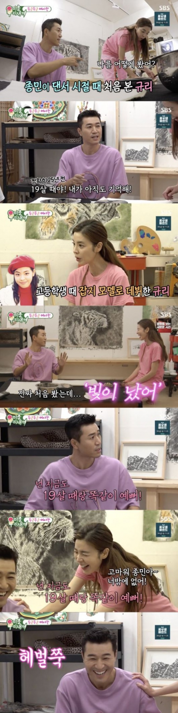 김종민은 과거 댄서 시절 김규리를 처음 봤던 것을 회상하며 "19살 때다. 아직도 기억난다. 아마 패션모델 했을 때였다"라고 말했다.