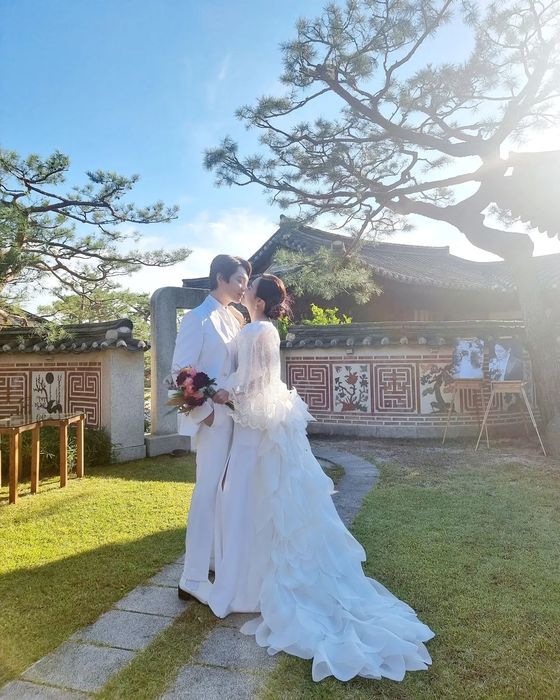 공개된 사진 속에는 심은진과 전승빈 부부가 입을 맞추고 있는 모습이 담겼다. 순백의 웨딩드레스(신부예복)를 입은 심은진과, 새하얀 턱시도를 입고 야외에서 웨딩 파티를 연 두 사람의 모습이 눈길을 끈다.