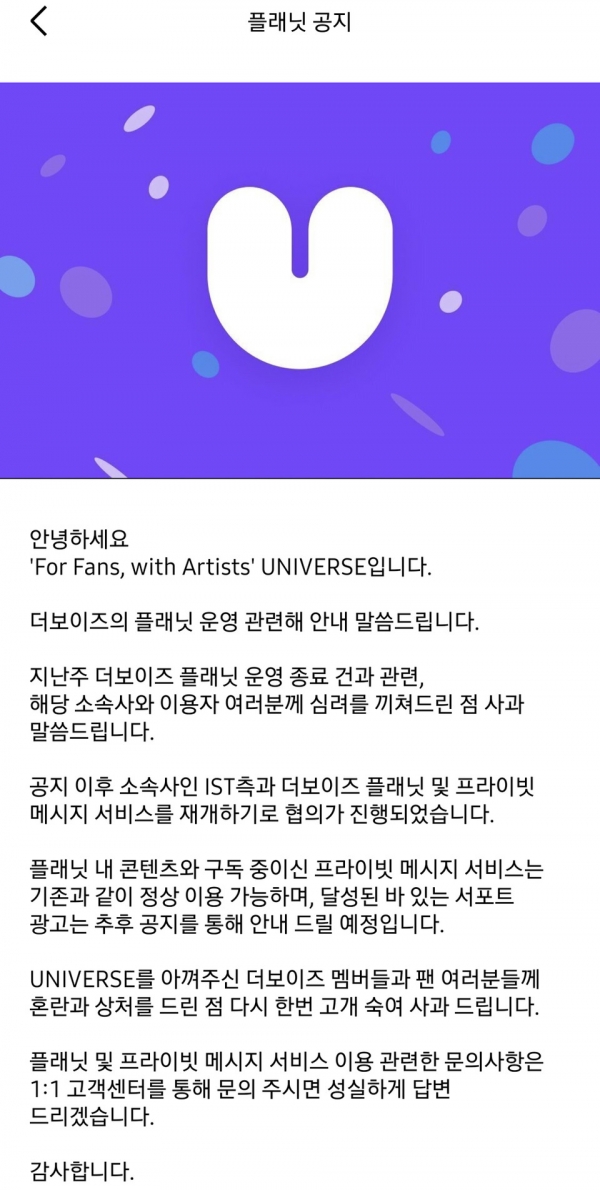 오늘(4일) 오후 유니버스 측은 플랫닛 공지사항을 통해 “지난주 더보이즈 플래닛 운영 종료 건과 관련 해당 소속사와 이용자 여러분께 심려를 끼쳐드린 점 사과 말씀드린다.”라는 내용을 공지했다.