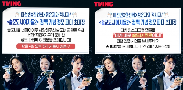 티빙 측은 공식 SNS 채널을 통해 '<술꾼도시여자들2> 컴백 기념 정모 파티에 초대합니다'라는 글을 게재했다.