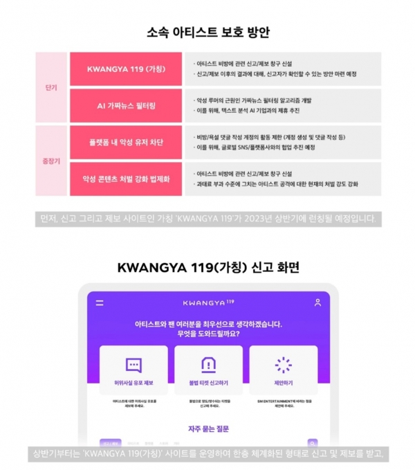 첫 번째로 '소속 아티스트 보호 방안'에 대해서 기존의 노력과 더불어 추가 시행할 네 가지 방안으로 ①아티스트 비방 관련 신고/제보 사이트 ‘광야 119(가칭)’ 론칭, ②AI 가짜뉴스 필터링 기능 도입, ③플랫폼 내 악성 유저 차단 방안 강구, ④악성 콘텐츠 처벌 강도 강화 법제화를 언급했다.