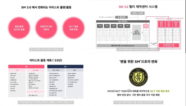 두 번째로 'SM 3.0에서 변화되는 아티스트 플랜/활동'과 관련해서는 ① 활동/플랜 공개 및 실행으로 올해('23년) 아티스트 활동 계획 발표, ②모든 아티스트를 위한 편중되지 않은 콘텐츠 제작, ③NCT 도쿄 팀을 마지막으로 무한확장 종료 예정에 대해 알렸다.