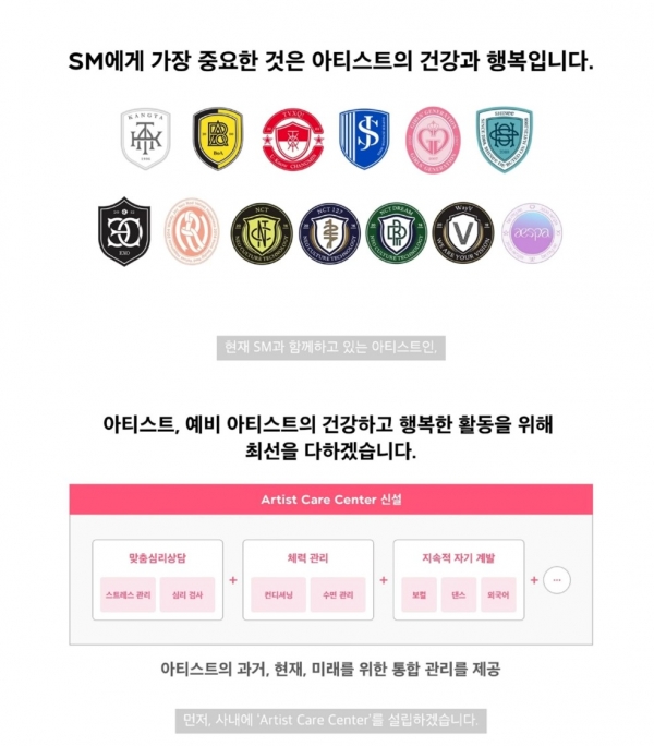 ‘아티스트 케어’ 부분에 대해서는 ①아티스트의 건강하고 행복한 활동을 위한 'Artist Care Center' 신설, ②맞춤심리상담, 체력관리, 자기계발을 위한 서포트 실시, ③미래의 모습을 위한 아티스트 라이프 플래닝 진행까지 아티스트의 과거, 현재, 미래를 위한 통합 관리를 제공할 것을 밝혔다.
