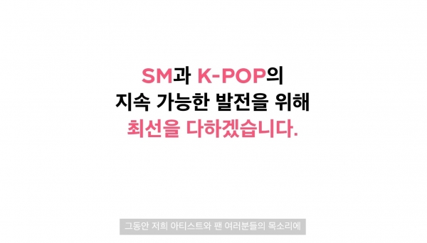 끝으로, SM과 K-POP의 지속 가능한 발전을 위해 최선을 다할 것임을 약속하며 빠르게 실행 가능한 방안들은 추진하면서 모든 K-POP 아티스트와 팬 여러분이 존중받고 보호받을 수 있도록 힘쓰겠다고 전하며 영상을 마무리 지었다.