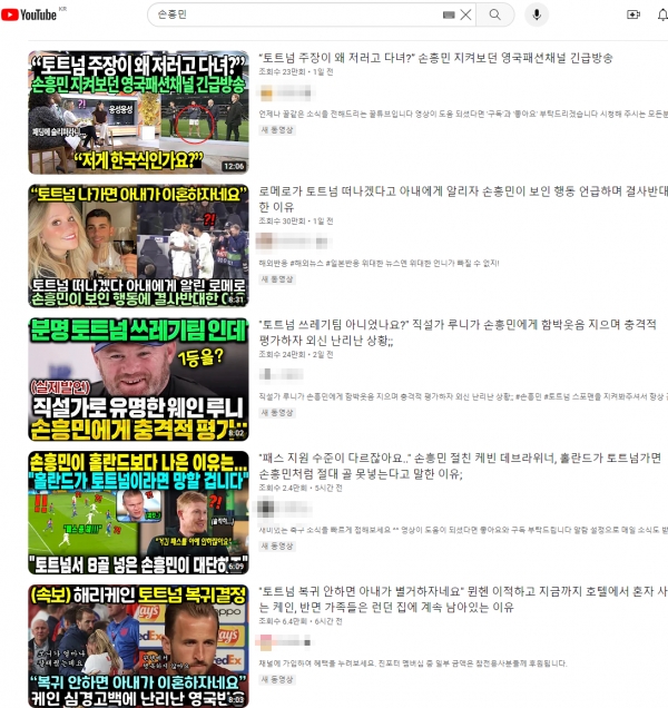 유튜브에서 그들의 '활동영상', '골이 들어가는 모습'이라도 찾아보고자 검색해보면 여러 영상들이 보인다. 하지만 골영상보다도 더 많이 검색되는 영상들은 대부분 유튜버가 제작한 위와 같은 영상이다. 제목부터 자극적이고 사람들이 클릭하고 싶게 만들어진 이미지와 썸네일로 가득하다.