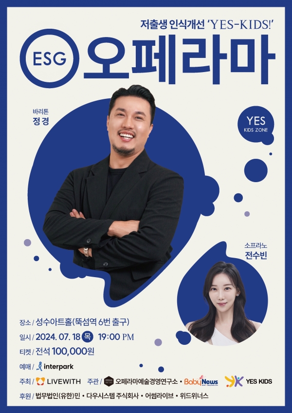 성악가 바리톤 정 경이 오는 7월 18일(목) 오후 7시 성수아트홀에서 ‘ESG오페라마’ 공연을 진행한다. 이번 공연은 기업의 ESG 경영 전환을 위한 종합 서비스를 제공하는 ESG 전문기업 ㈜리브위드가 주최하는 저출생 인식개선 캠페인 ‘YES-KIDS’의 일환으로 개최된다.