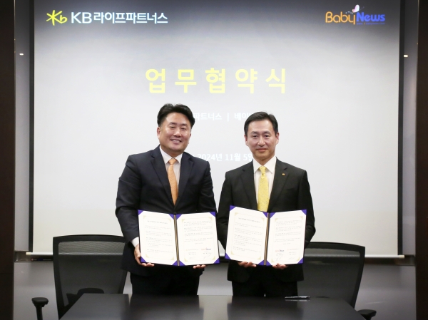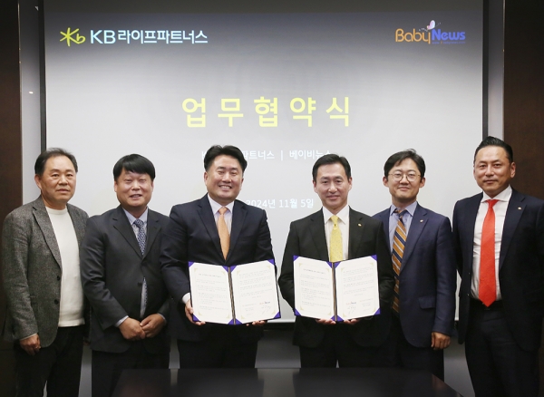 KB라이프파트너스와 베이비뉴스는 5일 오후 서울 강남구 강남대로 KB라이프타워 웰스매니지먼트센터에서 상호 업무협약을 위한 양해각서 체결식을 가졌다.