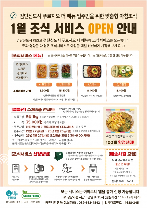 이러한 변화의 일환으로 인천 서구 검단신도시에 위치한 '검단신도시 푸르지오 더 베뉴'는 2025년 1월부터 아파트 주거서비스 전문기업인 ㈜유라이프와 협업해 조식서비스를 런칭한다고 발표했다. 이번 서비스는 검단신도시에서 처음으로 시행되는 아파트 조식서비스로, 검단신도시 대표 단지로서 '검단신도시 푸르지오 더 베뉴'의 단지 프리미엄과 가치를 높이고 입주민의 주거 생활 편의를 도와 주거만족도를 한층 강화할 것으로 기대된다.