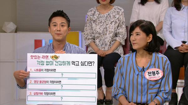 나를 두고 면을 논하지 말라! 국민 면 요리 ‘라면’! 1인당 연간 평균 라면 소비량이 무려 72.8개! 면 요리하면 절대 빠지지 않는 음식‘라면’! 전 국민의 사랑을 받고 있지만 과연 건강하게 먹을 수 있을까? 전형주 식품영양학과 교수와 라면 건강하게 먹는 법을 알아보고 박연경 요리연구가의 나트륨을 확! 줄인 시원한‘저염 해장라면’비법을 배워본다. 박태순 칼럼니스트의 혀를 속인‘저염 해장라면’의 맛은?!