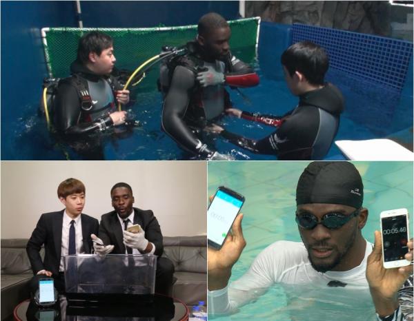 이뿐만이 아니라 수심 1M 깊이의 수영장에서 방수 실험부터 우유, 커피, 콜라, 식용유, 세탁세제까지 물 이외의 액체에 스마트폰을 빠트리는 기상 천외한 실험을 진행해 스마트폰의 방수 기능에 대해 다양한 방법으로 실험을 진행했다.