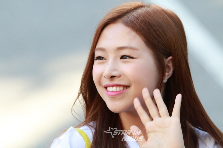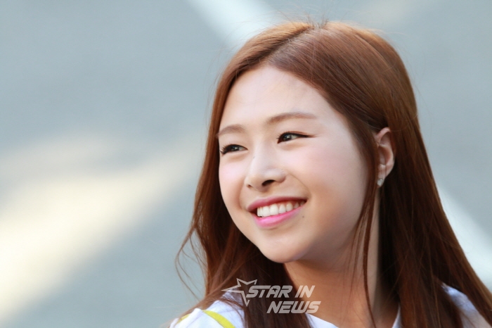 에이프릴 멤버 채원이 환하게 웃으며 카메라를 바라보고 있다.