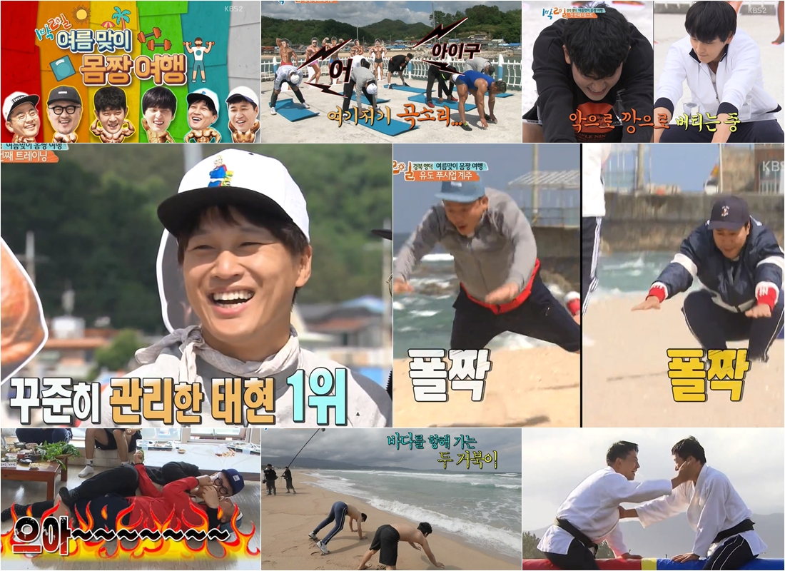 더불어 쌍둥이 유도선수인 조준호 선수와 조준현 선수와 함께 펼친 ‘전지훈련’에서는 멤버들과 선수들의 케미가 보는 재미를 선사했다. 팀장과 제자 한 명의 동반입수를 걸고 유도 푸시업으로 30M 경주를 하게 되자, 멤버들과 선수들은 비행본능을 불러일으켜 유도 푸시업으로 전진하는 모습으로 웃음을 선사했다. 이에 결국 입수에 당첨된 김종민과 조준현 선수는 마치 바다를 향해 나아가는 거북이처럼 유도 푸시업으로 바다로 향했고, 동반 입수를 해 이목을 집중시켰다.