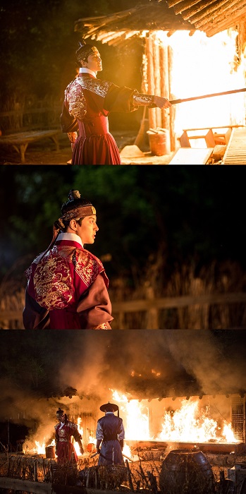 공개된 사진은 8일 방송될 4회의 한 장면을 포착한 것이다. 사진 속 이융은 어두운 밤, 초라한 초가집 앞에 서 있다. 이융의 손에는 그가 입은 옷의 빛깔처럼 붉게 불타오르는 횃불이 들려 있다. 횃불을 휘두르는 이융의 모습, 활활 타오르는 초가집, 검은 하늘을 가득 메운 연기 등이 결코 심상치 않은 상황임을 짐작하게 한다. 대체 이 초가집은 누구의 것일까? 어떤 이유로 만인지상 군주인 이융이 직접 나와 횃불을 휘두르게 된 것일까.