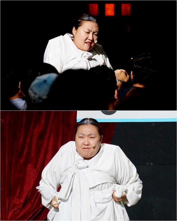 지난 14일 진행된 공개 녹화에서 이수지가 등장하자 객석은 웃음 소리로 가득 찼다. 이수지가 파격적인 ‘어깨뽕’ 소복패션을 선보인 것. 특히 이수지는 하이패션 포즈로 객석을 뒤집더니, 돌연 객석으로 난입해 공개 녹화장의 열기를 뜨겁게 달구었다. 급기야 이수지는 방청객과의 파격적인 커플 포즈를 선보여 현장을 웃음바다로 만들었다는 후문이다.