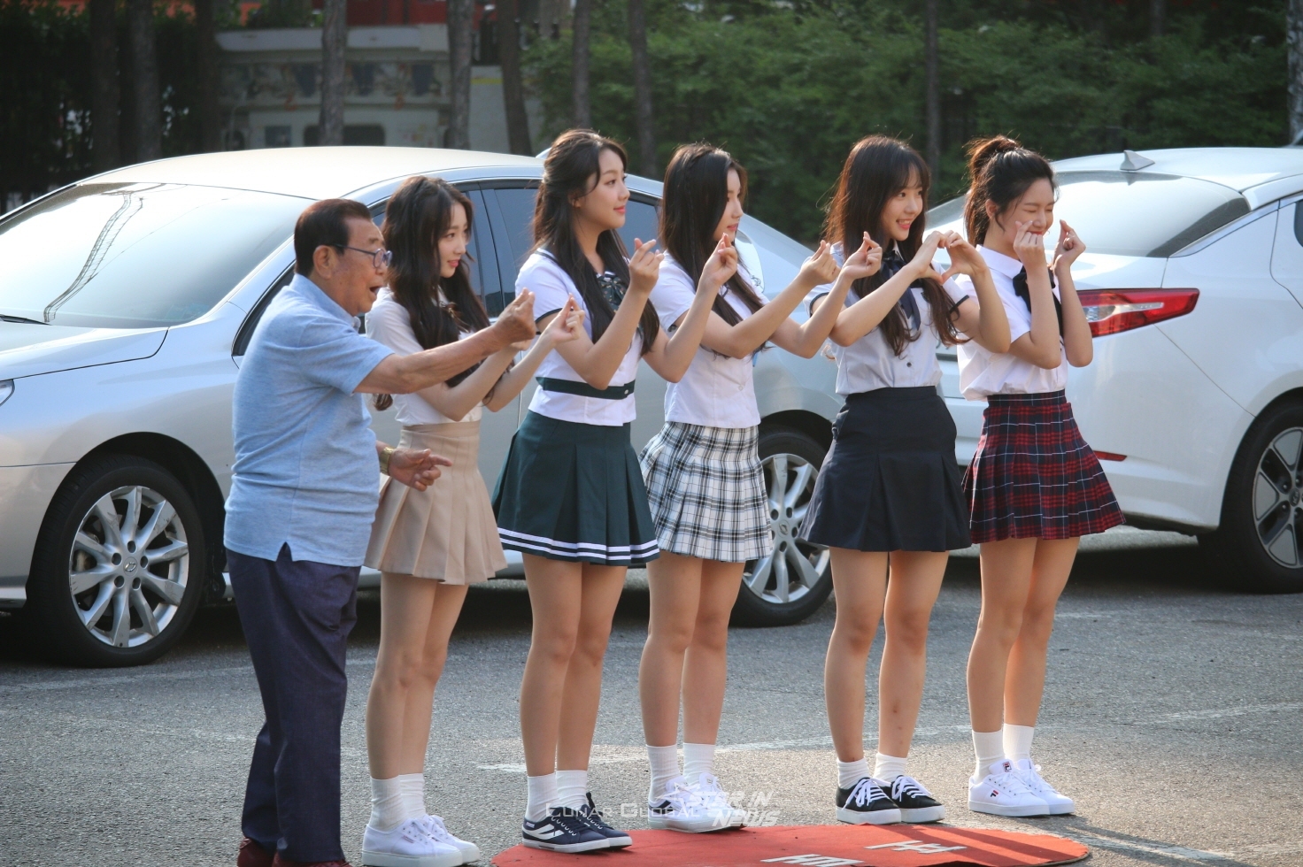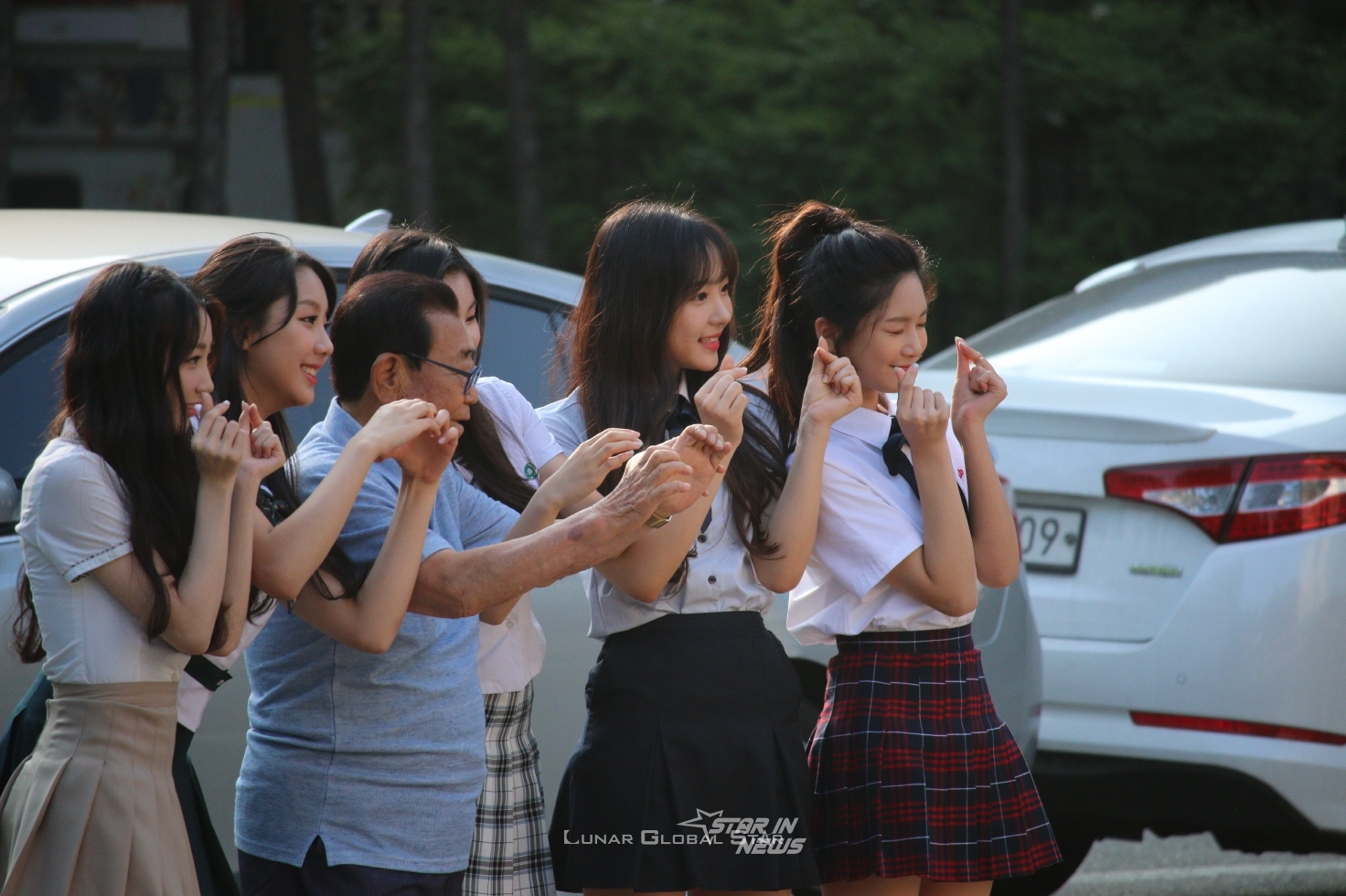 걸그룹 엘리스(ELRYS, 유경, 소희, 벨라, 혜성, 가린)가 지난 23일 KBS 신관 공개홀에서 진행된 '뮤직뱅크' 리허설에 참여하기 위해 출근길에 오르며 '송해'와 포즈를 취하고 있다.