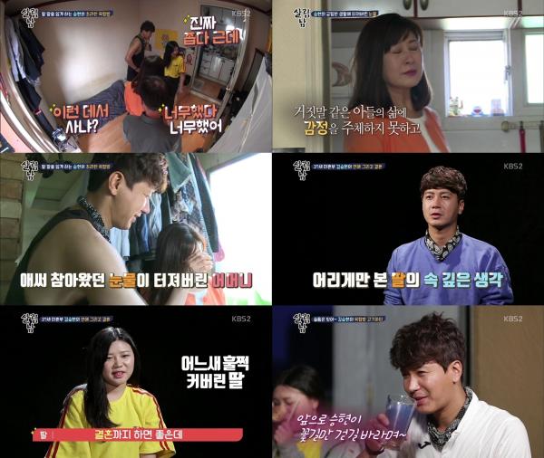 결국 상상도 못했던 아들의 궁핍한 생활에 속상해 급기야 눈물이 터져나왔다. 어머니의 눈물에 모든 게 자기 탓인 것만 같은 아들 김승현의 마음도 무너지는 마찬가지. 온가족이 다같이 눈물을 흘리고 삼키며 한동안 무거운 분위기가 감돌았다.