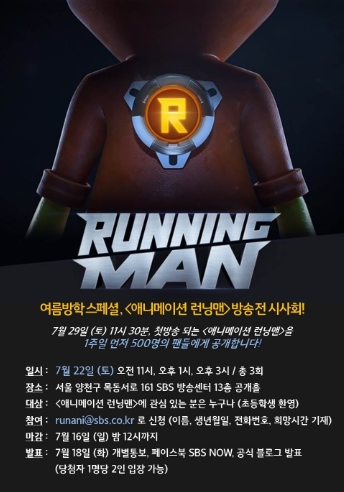 ‘애니메이션 런닝맨’에 관심 있는 시청자는 오는 16일 밤 12시까지 신청자 이름, 생년월일, 전화번호, 희망시간을 기재해 이메일(runani@sbs.co.kr)을 통해 특별 시사회 참가 신청을 할 수 있으며, 오는 18일 무작위 추첨을 통해 당첨자를 선정해 개별통보할 예정이다.