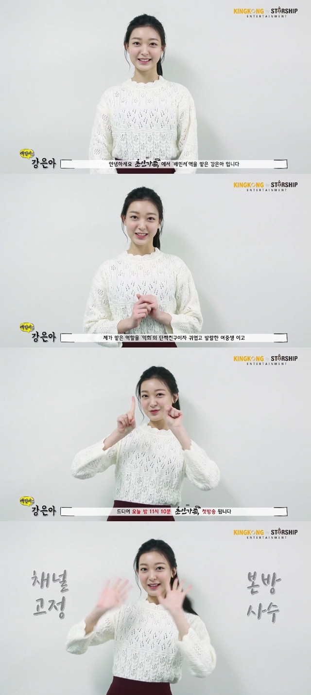 20일, 소속사 킹콩 by 스타쉽 측은 네이버 TV캐스트(tvcast.naver.com/kingkong)와 공식 유튜브 채널(youtube.com/c/KINGKONGEntertainmentOfficial)을 통해 SBS 새 미니드라마 ‘초인가족 2017(극본 진영, 연출 최문석)’에서 배민서 역을 맡은 강은아의 본방사수 독려 영상을 공개했다.