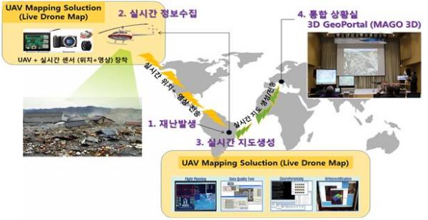 라이브 드론맵 기술은 재난 상황이 발생하거나 평화유지를 위한 군사 활동 등 접근이 불가능한 지역에 드론을 띄워 지도를 구축하고 이를 실시간으로 확인할 수 있는 기술로서, 현장에 띄워진 드론을 통해 공간정보를 취득 → 전송 → 자동 매핑(mapping) 하여 멀리 떨어진 곳에서도 실시간으로 현장을 확인할 수 있게 해 준다.