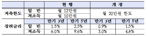 이번 개정은 연간 저축납입금액 최고한도와 저축장려금 지급율 조정, 국외이주 사유로 중도해지시 저축장려금 지급대상 제외 등을 위한 사항을 규정했다.