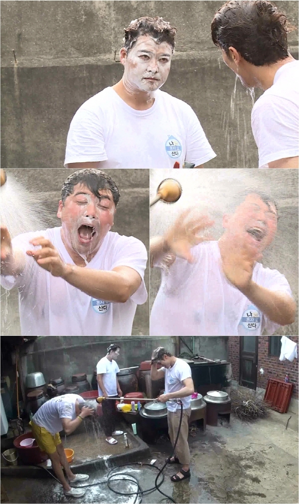 무엇보다 전현무가 ‘원터치’ 샤워를 하는 모습이 선 공개돼 보는 이들의 시선을 강탈한다. 그는 야외 수돗가에서 샤워하는 만큼 한 번에 헹구기 위해 머리카락부터 목까지 비누칠을 꼼꼼하게 했다. 이로 인해 비누로 가부키 화장을 한듯한 그의 얼굴과 모든 것을 다 내려놓은 듯한 그의 표정이 포착돼 폭소를 자아낸다.