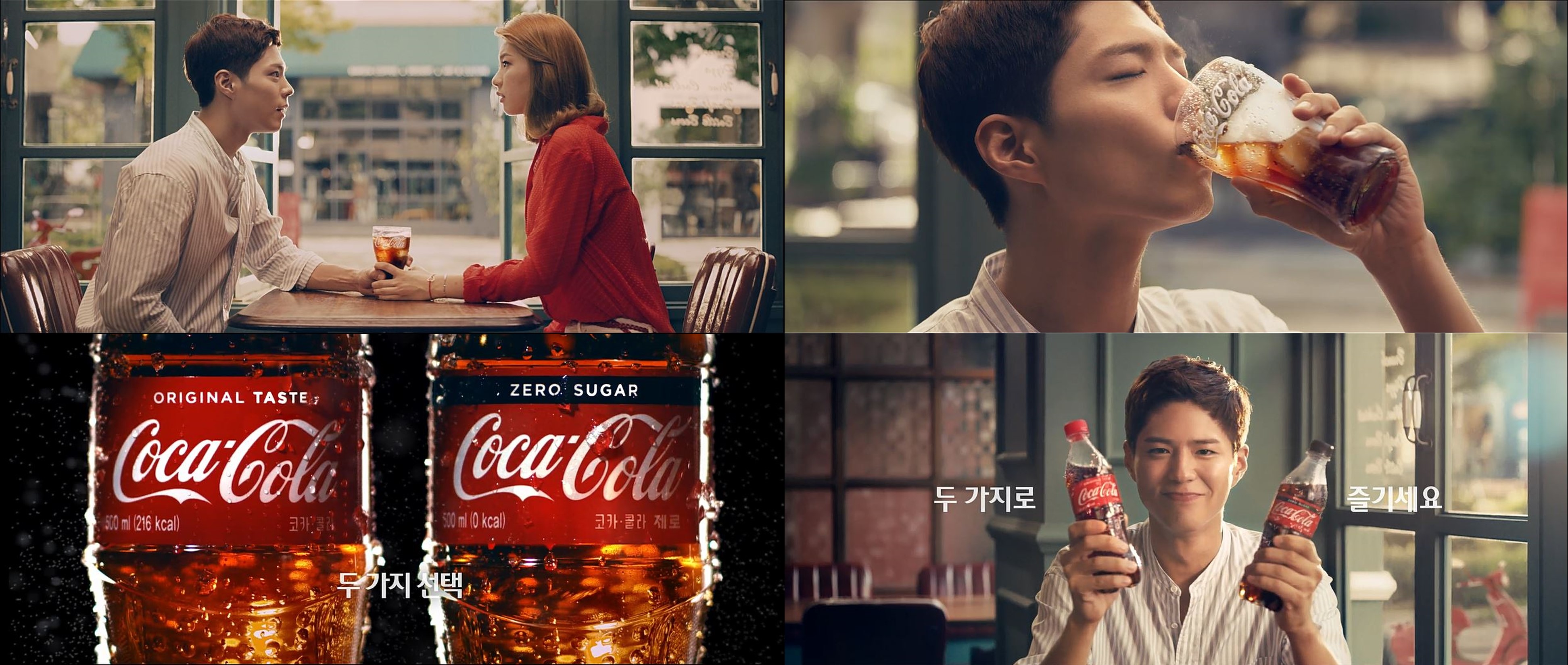 새롭게 선보이는 광고에서는 대세배우 박보검의 매력이 먼저 눈에 띈다. 박보검은 ‘맛있는 코카-콜라, 두 가지로 즐기세요’ 라는 콘셉트에 맞춰 양 손에 코카-콜라를 들고 시청자를 매혹한다. 누구에게도 양보할 수 없는 짜릿한 코카-콜라를 사수하는 버전의 광고영상은 박보검이 코카-콜라 한 잔을 앞에 두고 펼치는 밀당을 그린다. 간발의 차로 먼저 코카-콜라를 쟁취한 박보검의 표정이 의기양양하다. 친구의 얼굴에 아쉬움이 스치자, 금새 오리지널과 제로슈거의 두 가지 코카-콜라를 내밀며 “둘 다 너 마셔”라고 달콤한 로맨틱가이의 면모를 보인다.