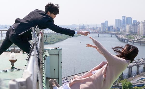 사진 속 재찬은 옥상 난간에 선 홍주를 말리기 위해 한 발짝 한 발짝 조심스럽게 다가가고 있고, 그의 뒤에서 홍주의 이모(이정은 분)가 초조한 표정으로 홍주를 바라보고 있어 긴박함을 더한다.
