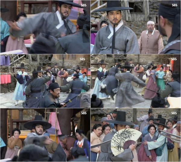 이에 무리중 한명이 그를 향해 “가던 길 가세요 고귀한 양반님네”라며 가슴팍을 쳤고, 그 순간 이겸이 그의 손목을 잡은 뒤 가격해 쓰러뜨리기에 이르는 것. 같은 무리들이 한꺼번에 검을 들고서 달려들었고, 이에 이겸은 그들을 향해 도포자락이 휘날릴 정도로 손과 발을 써서 그들을 제압했다. 그러다 무리들이 전열을 가다듬고는 검을 세우자 이겸은 부채를 펼치며 날카로운 눈빛을 선보여 더욱 팽팽한 긴장감을 고조시키기도 했다.