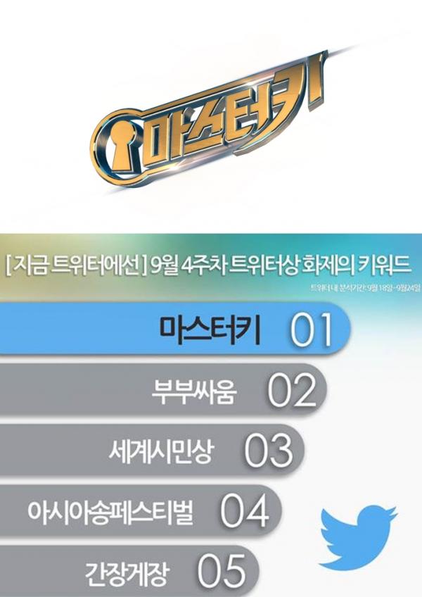 트위터 측은 26일, 지난 한 주간 (9월 18일∼9월 24일) 트위터 상에서 가장 이슈가 된 ‘화제의 핫 키워드’를 발표했다. 이 결과에 따르면 지난 주 트위터 상에서 가장 많이 버즈를 발생시킨 키워드 1위는 SBS ‘마스터키’로 조사됐다. 아직 첫 방송도 시작하지 않은 프로그램이 이례적으로 '핫키워드' 1위에 올라 눈길을 끈다.